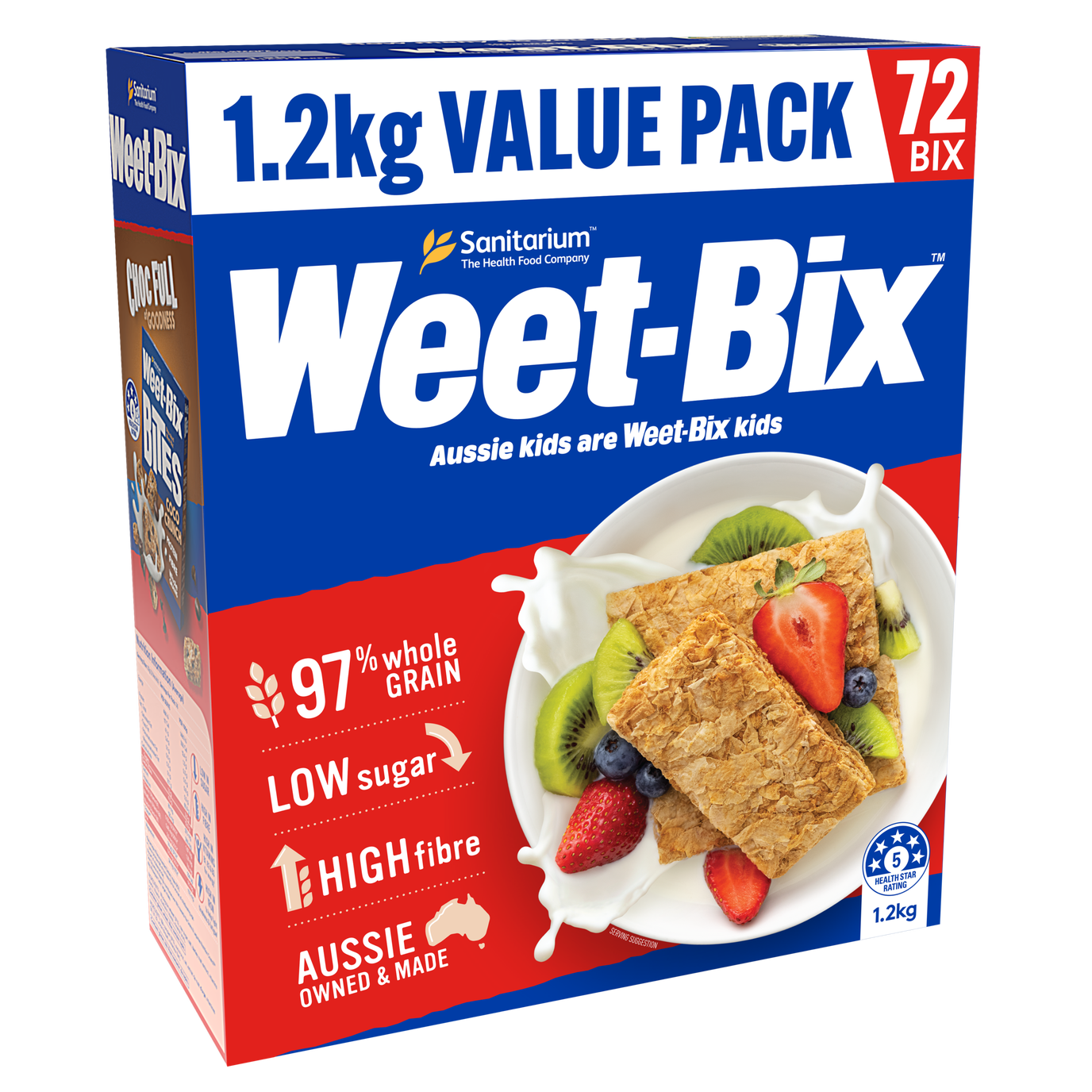 Sanitarium Weet-Bix™ contains 97% whole grain, low sugar and saturated fat, high fibre, and is a good source of iron and B-vitamins. Aussie owned & made.